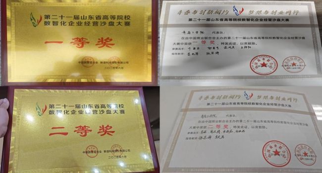 由中国商业联合会、新道科技股份有限公司主办,济宁公司承办的第二十一届山东省高等院校数智化企业经营沙盘大赛于6月在济宁市举办。经过初赛的激烈角逐,共有38所高校108支队伍晋级山东省总决赛,公司由太阳成集团122ccvip李光琴、张思海老师带队赴现场参加全山东省总决赛,参赛团队在比赛中沉着应对、协同合作,最终经激烈角逐,太阳成集团122ccvip的两支队伍分别荣获团体一等奖和团体二等奖。