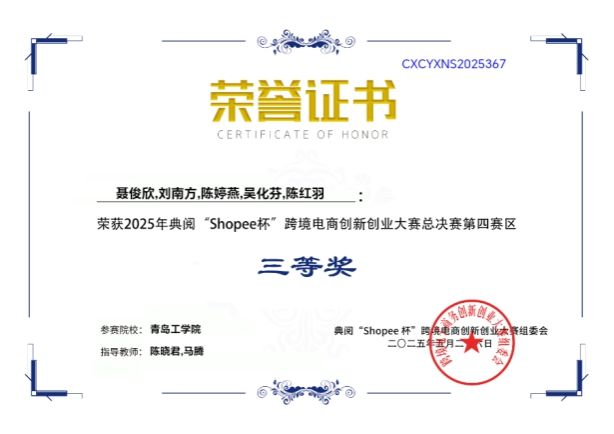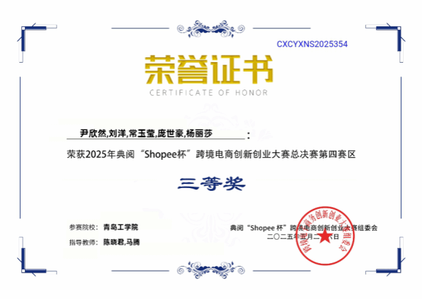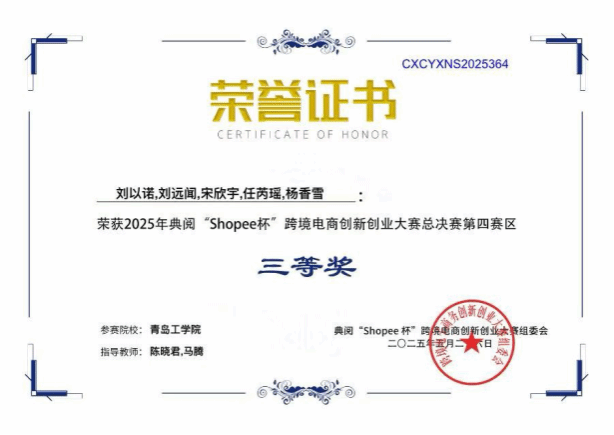 近日,2025年典阅“Shopee杯”跨境电商创新创业大赛总决赛圆满落幕,太阳成集团122ccvip共派出3组同学在陈晓君和马腾老师的指导下,经过激烈竞争,荣获三等奖3项。