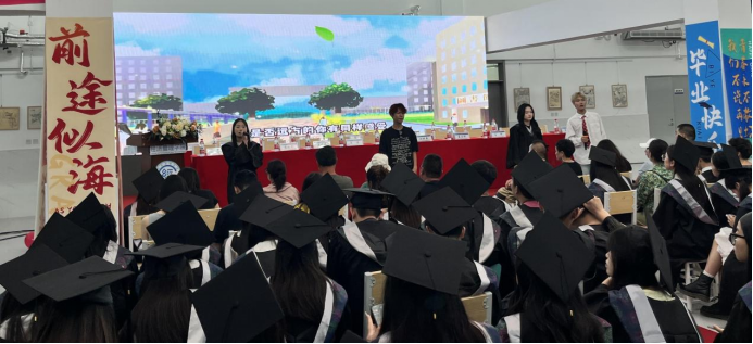仪式在充满青春回忆的暖场氛围中拉开序幕。员工视频《最好的我们》带领毕业生们重温求学时光的点点滴滴,教师视频《祝福》传递着师长的殷殷期盼,暖场音乐的旋律点燃了现场的热烈气氛。庄严的国歌声随后奏响,全体师生肃立齐唱,家国情怀在心中激荡升腾。