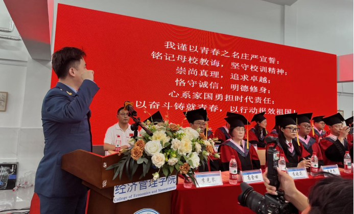 在马克思主义公司优秀毕业生郭鹏鹏的带领下,全体毕业生高举右拳,庄严宣誓:“铭记母校教诲,坚守校训精神;崇尚真理,追求卓越;恪守诚信,明德修身;心系家国勇担时代责任;以奋斗铸就青春,以行动报效祖国!”铿锵誓言回荡大厅,彰显了新时代青年的责任与抱负。